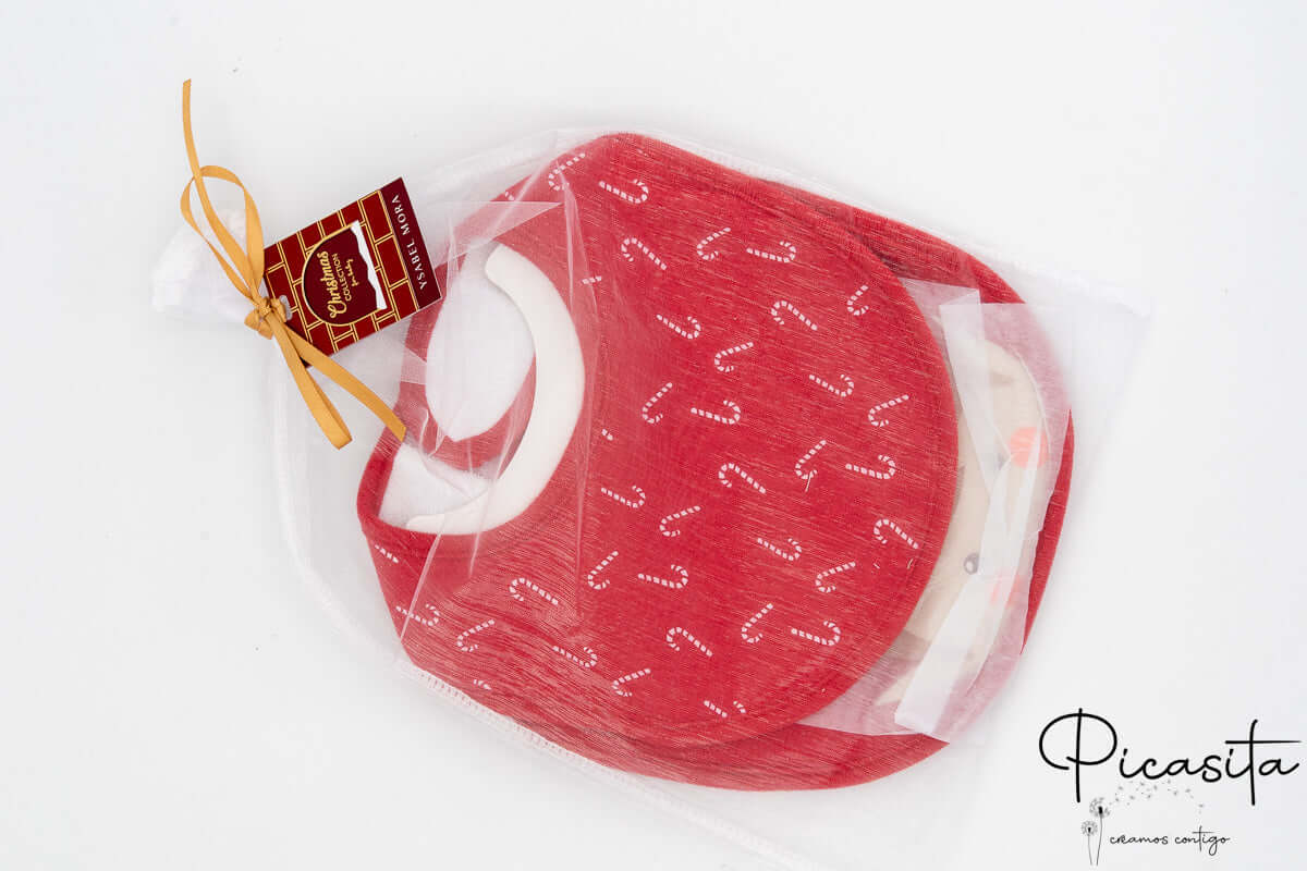 Que comprend exactement le paquet ?Le paquet comprend deux unités (un pack double) du bavoir de Noël en rouge avec le motif de cannes en sucre d’orge, présenté dans un joli sac en tulle.