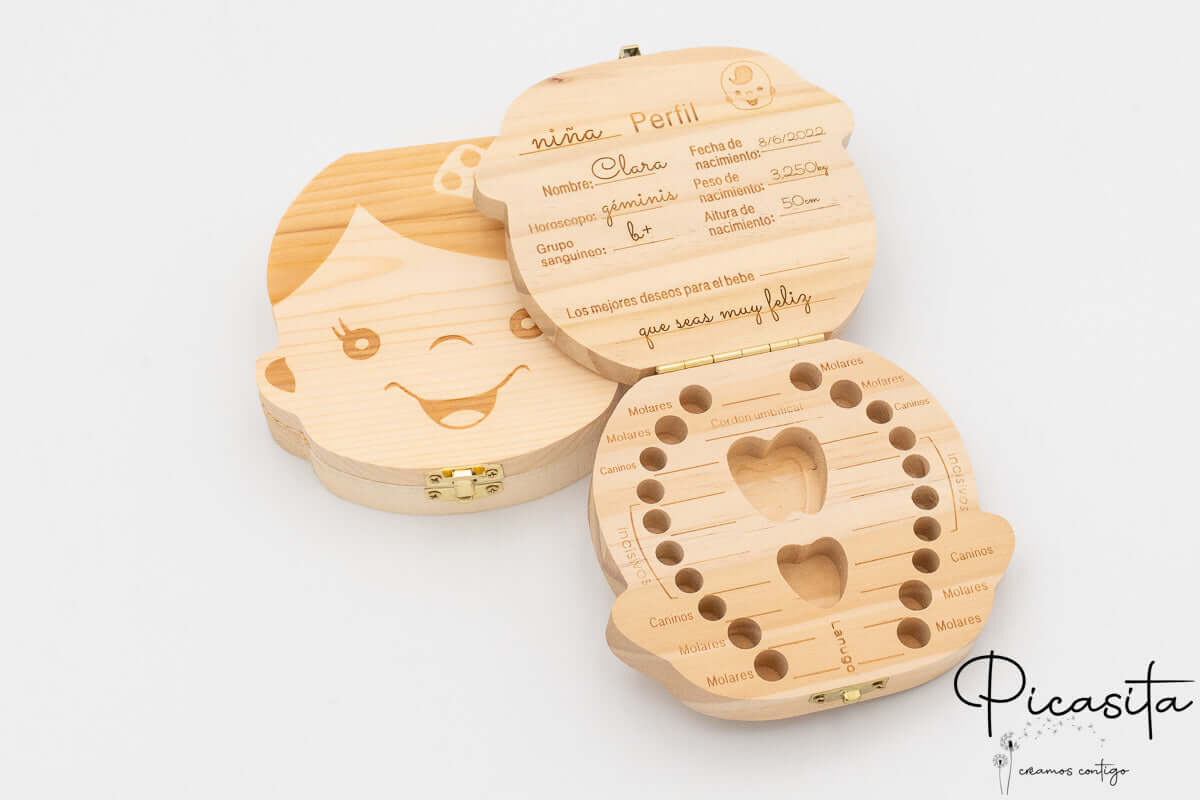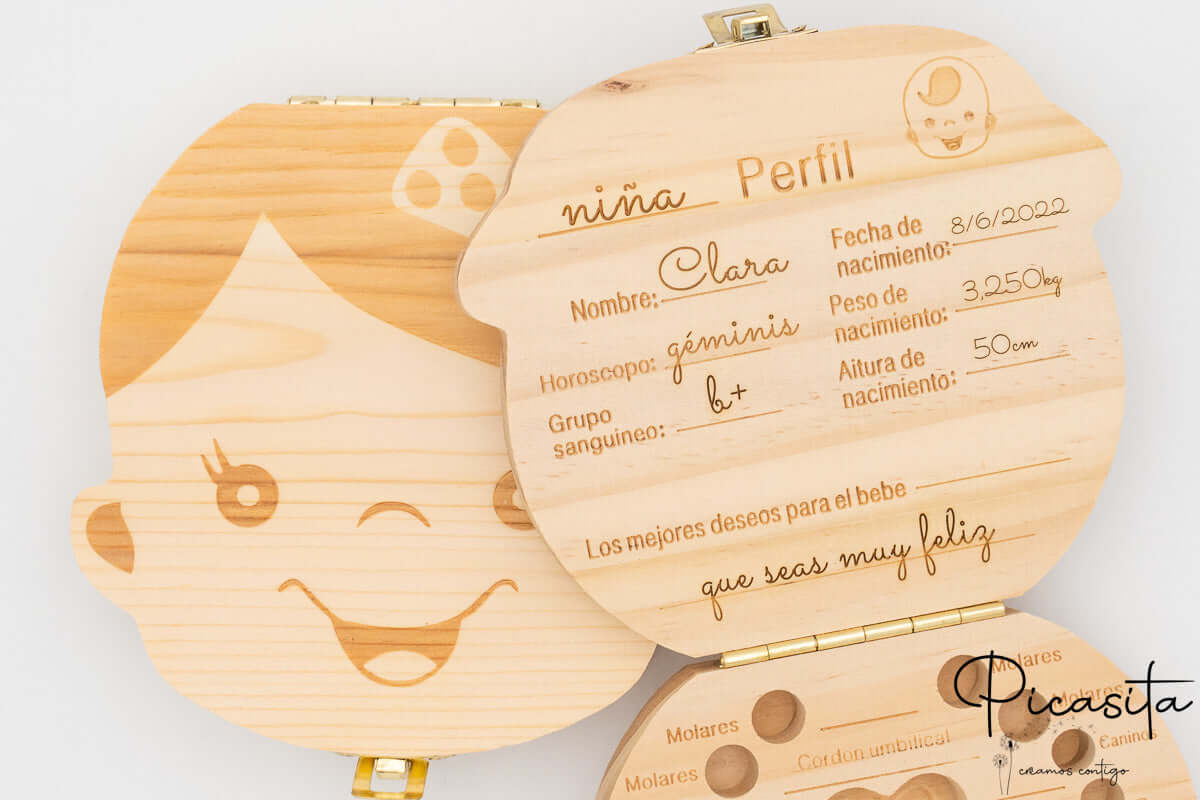 Nous comprenons que derrière chaque grand odontologue se cache un petit collaborateur qui prête son nom pour identifier le cas d'étude. C'est pourquoi nous personnalisons chaque boîte à dents de lait par laser de haute précision, gravant le nom de l'enfant directement dans le bois (résultat en ton foncé/brûlé permanent). Sur le couvercle intérieur, l'étudiant pourra enregistrer des données biométriques clés telles que la date de naissance, le poids, la taille et le groupe sanguin du collaborateur.