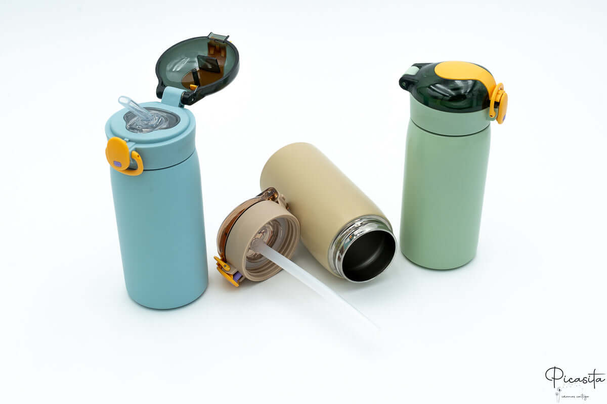 La fonctionnalité est essentielle dans une gourde isotherme pour enfants. C'est pourquoi ce modèle intègre un bouchon en polypropylène de haute qualité, un matériau totalement sûr pour le contact alimentaire. Le point fort est sa paille rétractable intégrée : en la déployant, l'embout du bouchon permet de boire directement de manière confortable et simple. C'est la solution parfaite pour éviter les déversements accidentels pendant qu'ils jouent ou étudient.