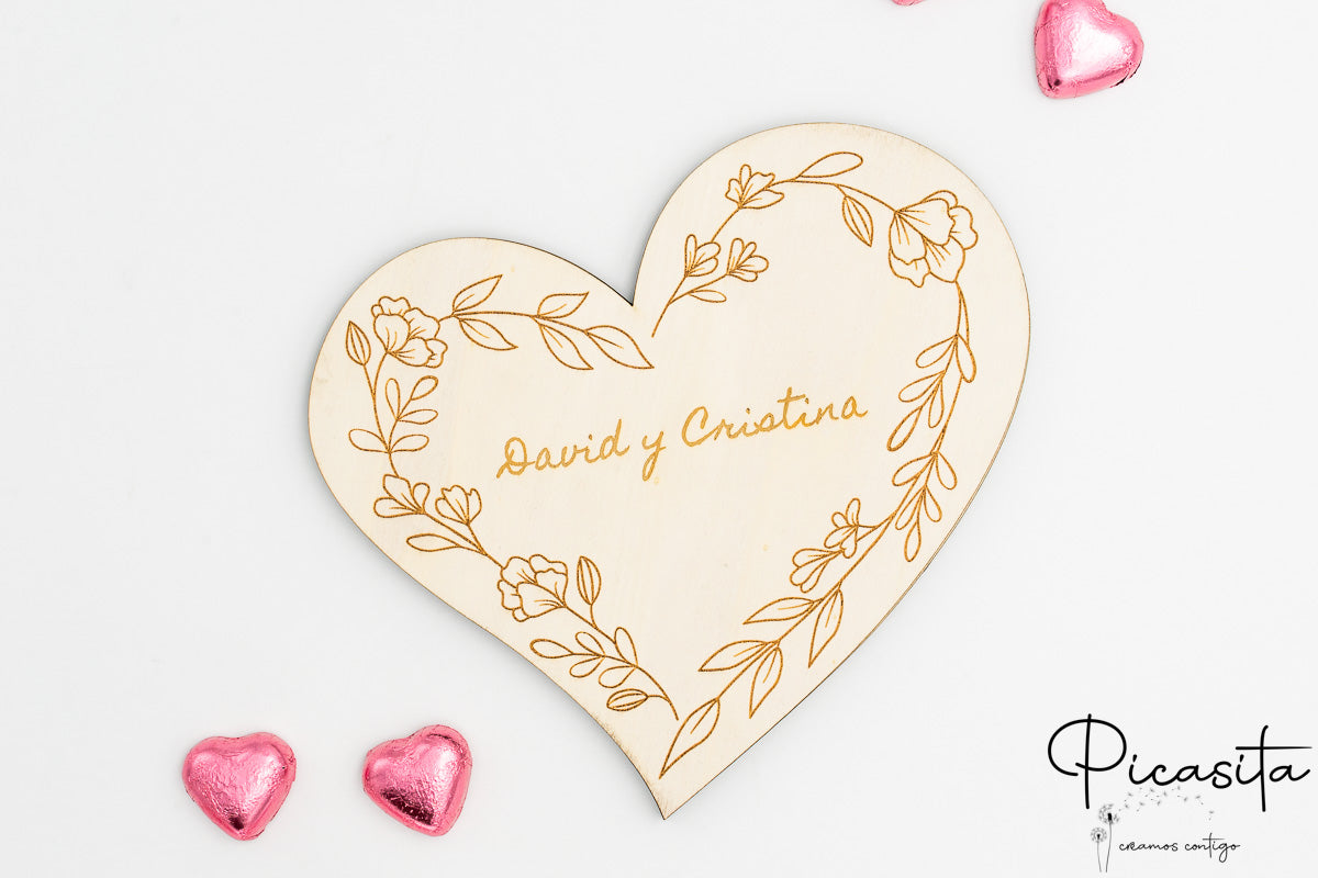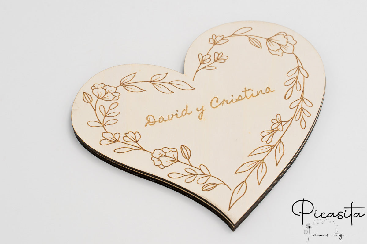 En plus d’être un passe-temps amusant à assembler en couple, la boîte en forme de cœur sert à ranger les pièces ou comme petit coffret à bijoux sentimental. Le couvercle est également personnalisé avec vos prénoms et ce motif floral qui apporte de la chaleur. Sans aucun doute, c’est un cadeau romantique qui va au-delà du matériel, rappelant chaque jour les fondements de votre union.