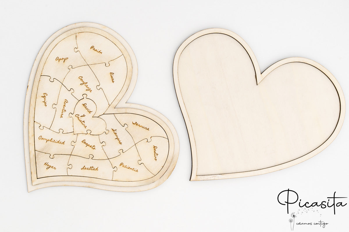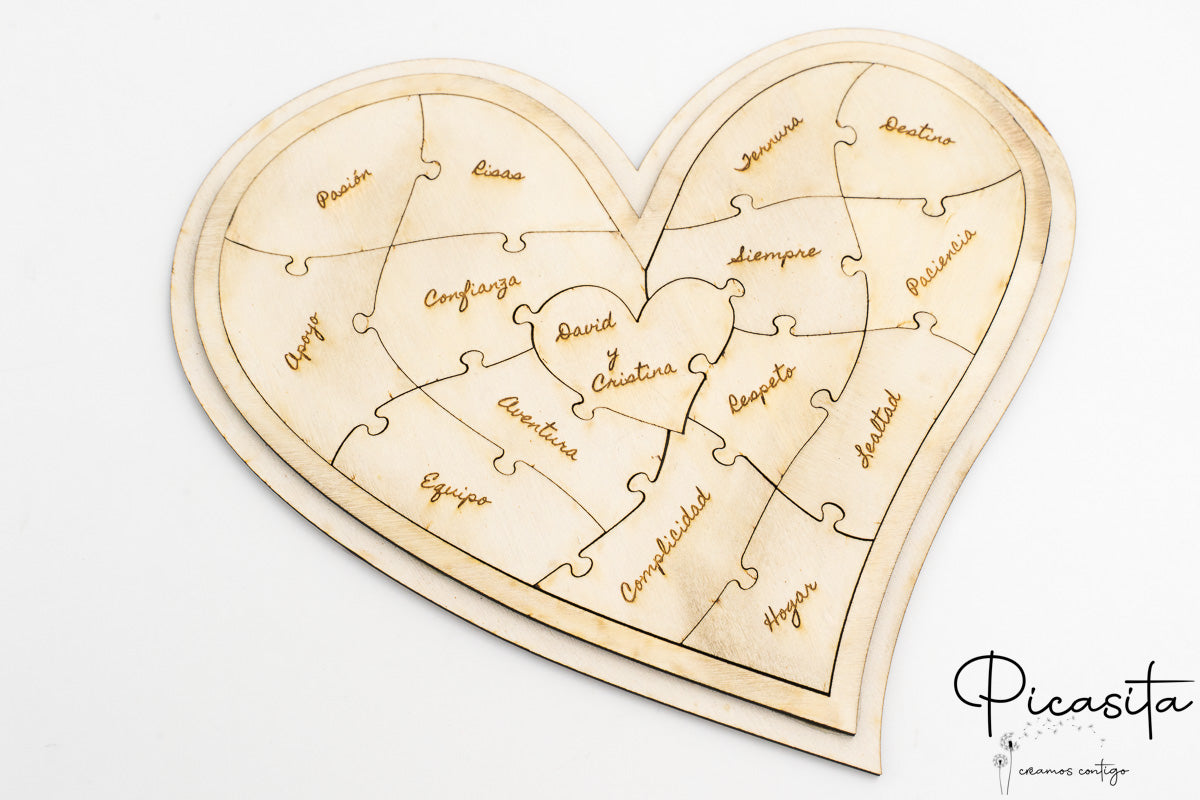 Ce puzzle des amoureux est fabriqué en bois naturel de haute qualité et se compose de pièces qui s’emboîtent parfaitement. Chacune d’elles porte gravé un des 14 mots qui définissent les piliers d’une relation solide : confiance, passion, rires, soutien, aventure, entre autres. Au centre, réunissant le tout, se trouve la pièce la plus importante personnalisée avec vos prénoms, symbolisant que vous êtes le noyau de tout cet amour.