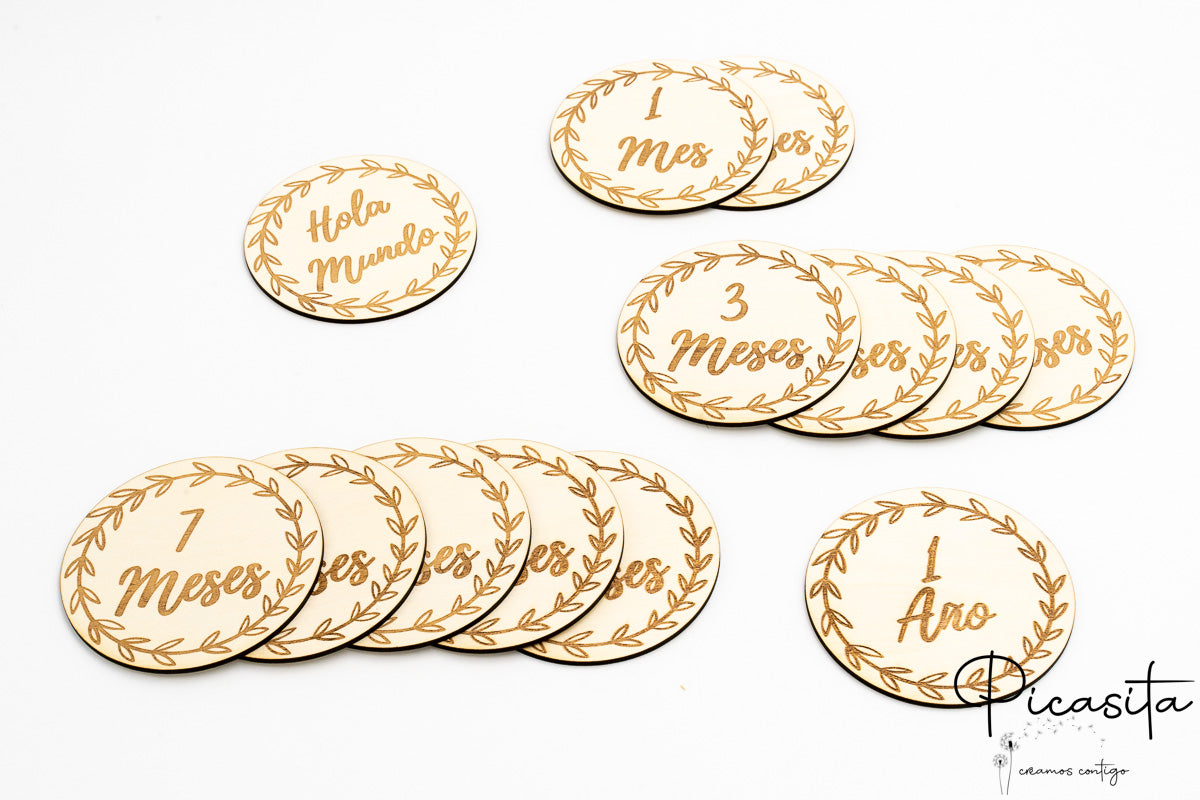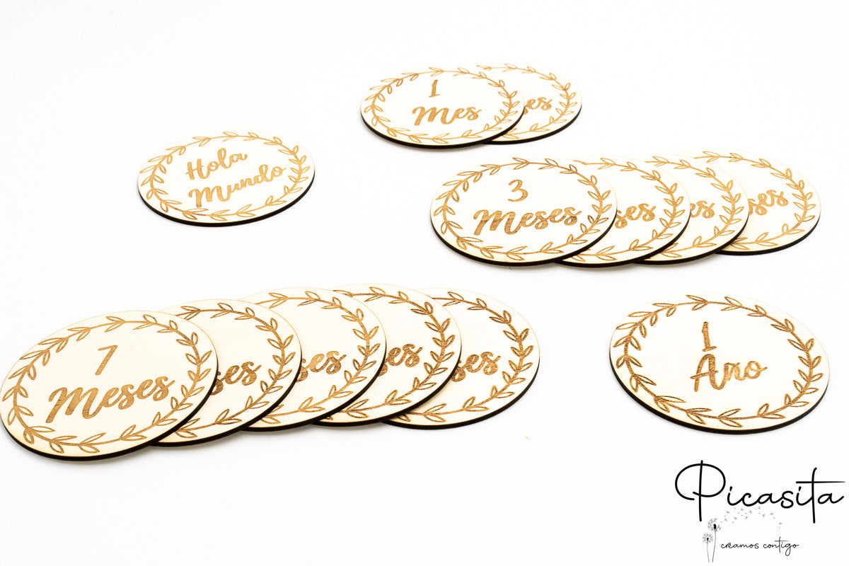 Gravés au laser de haute précision, ces disques présentent un dessin de couronne végétale qui encadre les chiffres et textes en espagnol. Ils sont légers, durables et totalement sûrs à utiliser comme accessoire photographique sous surveillance.