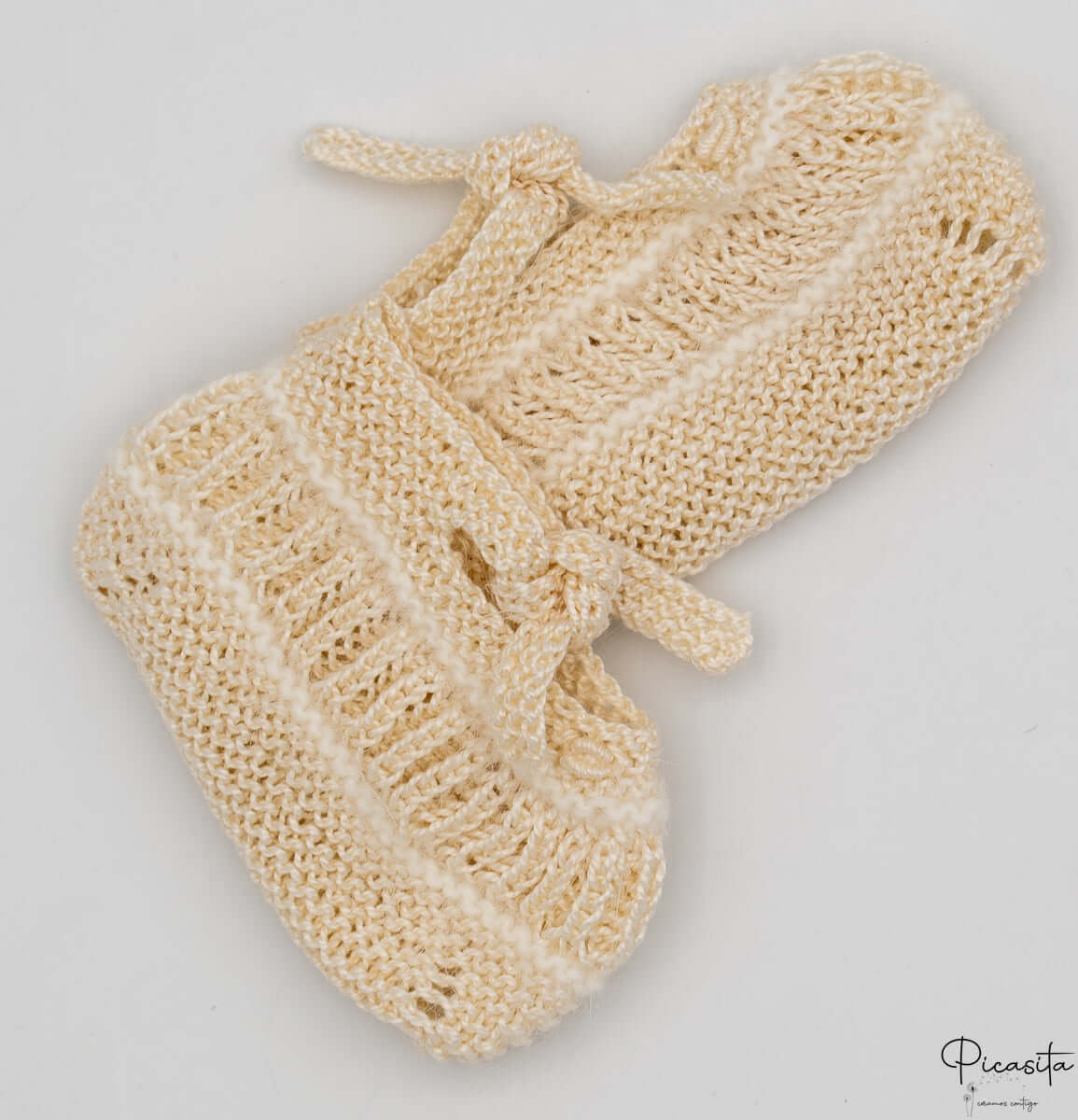 Ils sont fabriqués avec une combinaison de Perlé Beige DMC 5 pour la structure, Nylgorina Stop Blanche pour apporter une douceur similaire aux chaussons en laine et des détails en Rococo Beige.