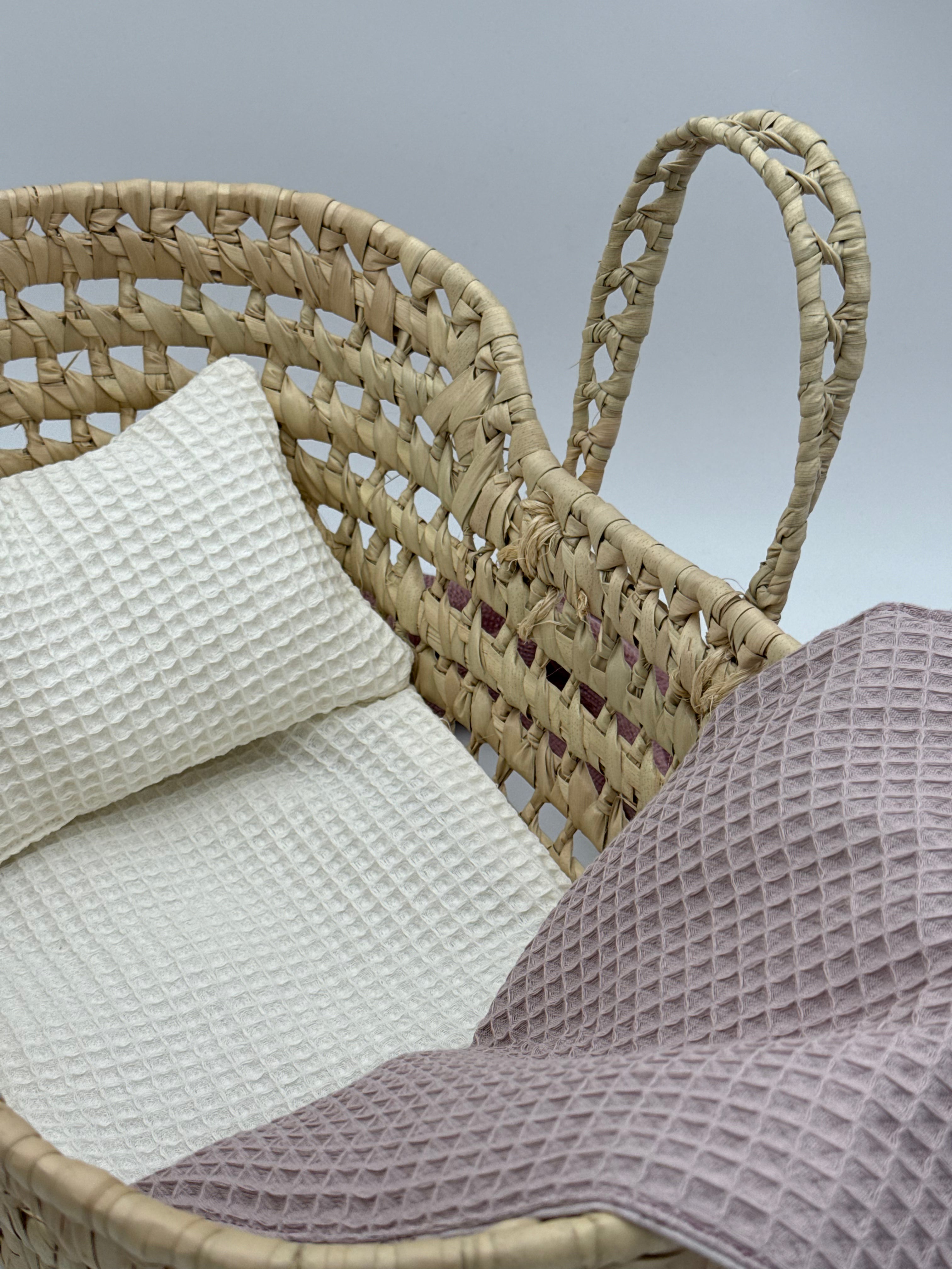 Ce qui fait vraiment briller notre berceau artisanal, c’est sa literie. Nous confectionnons chaque ensemble de manière totalement artisanale dans notre atelier. L’ensemble comprend un coussin moelleux en tissu gaufré blanc doux et un petit sac avec un délicat imprimé floral aux tons mauves. En choisissant ce couffin pour poupée, vous optez pour un produit durable qui respecte les rythmes de l’enfance et favorise un jeu créatif rempli de câlins et de souvenirs inoubliables.