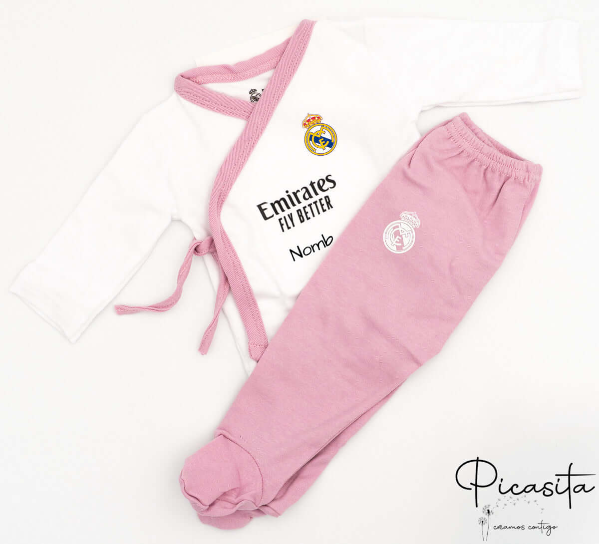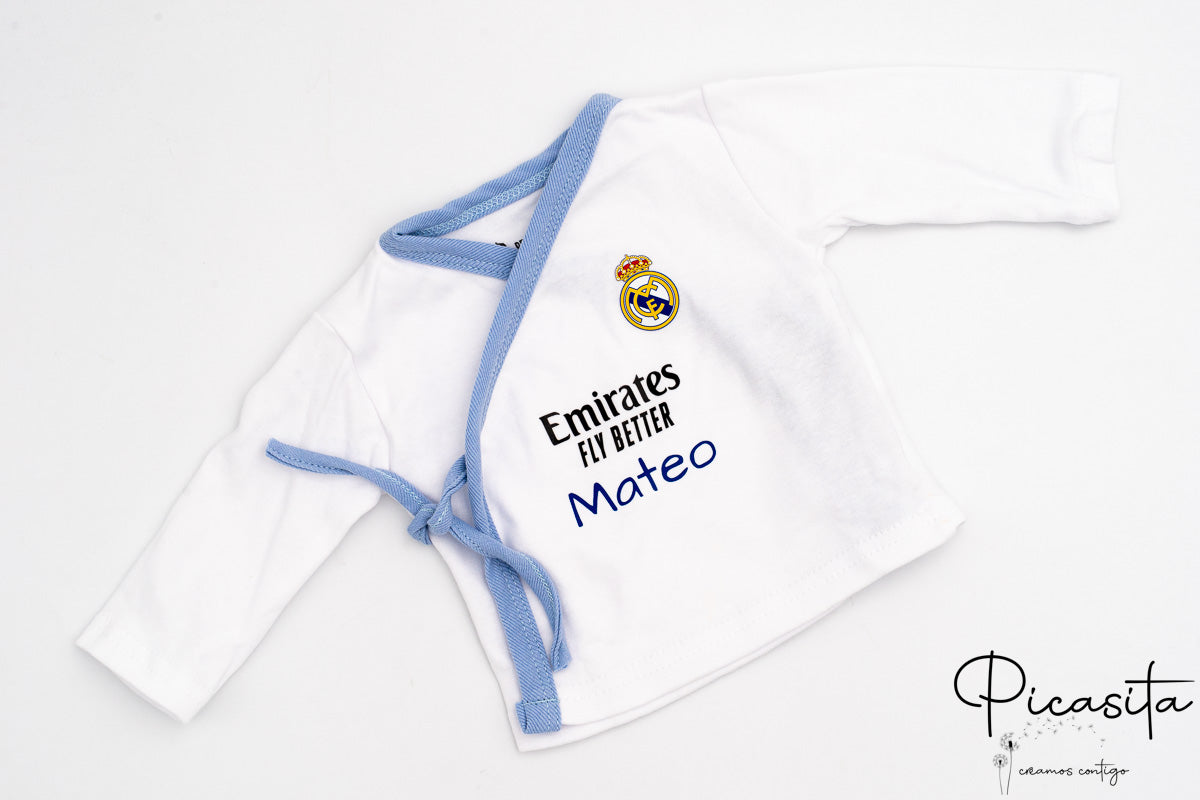 Ce qui rend ce cadeau inoubliable, c’est la possibilité de le personnaliser. Nous appliquons le nom du bébé au moyen d’un vinyle thermocollant de haute qualité directement sur le t-shirt de l’ensemble. Cette finition est douce au toucher, résistante et garantit que le nom s’affiche parfaitement à côté de l’écusson merengue.