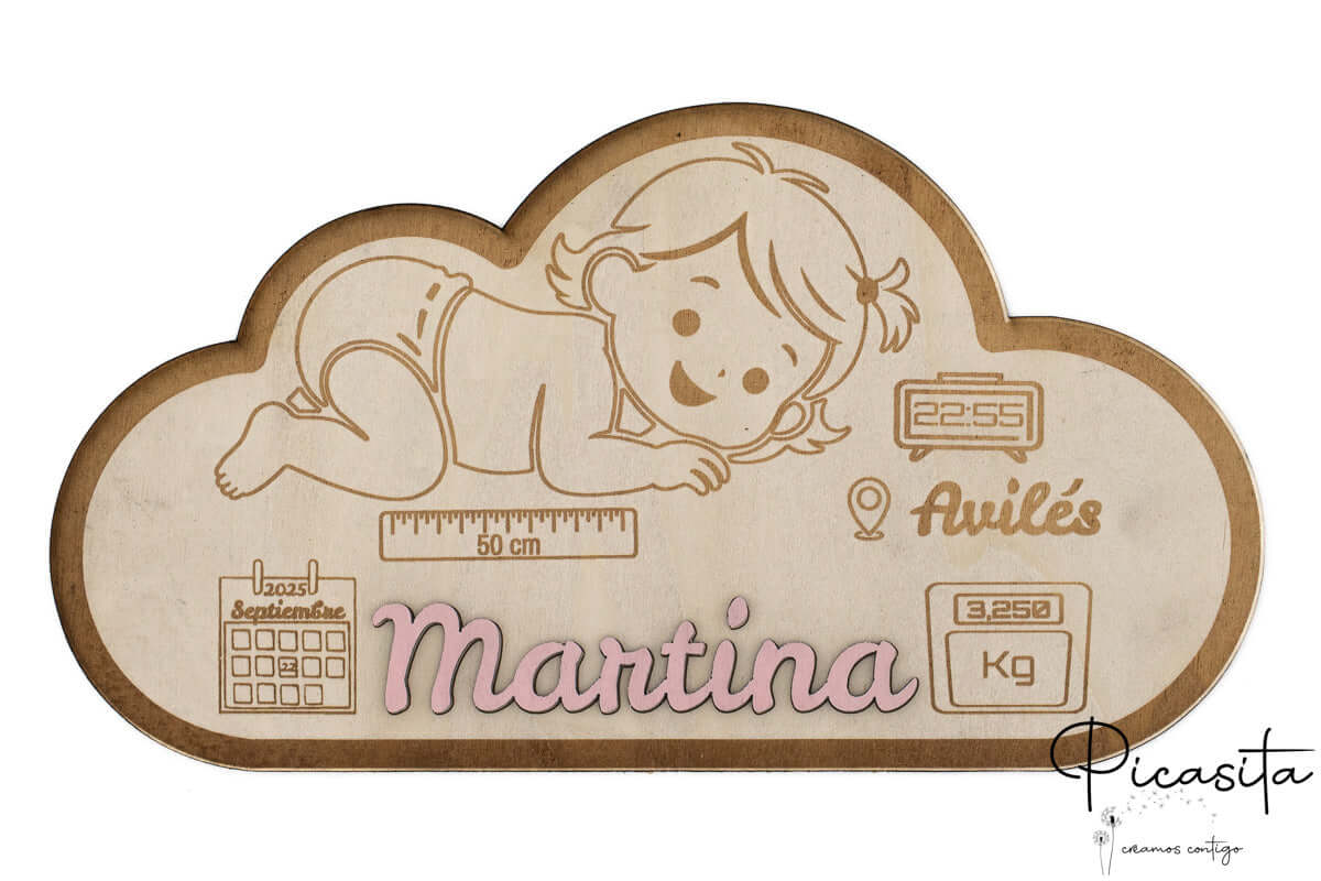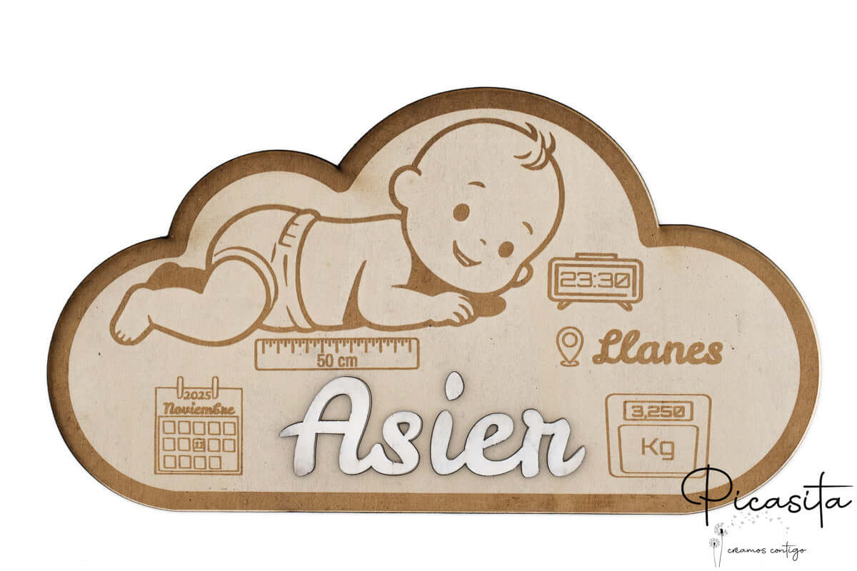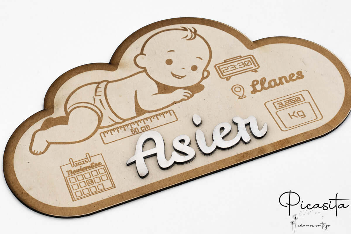 Chez picasita.es, nous savons que les premiers instants d’un enfant sont sacrés. C’est pourquoi notre faire-part en bois artisanal n’est pas seulement une décoration, mais un trésor physique qui capture l’essence du jour le plus important de votre vie. Fabriqué en contreplaqué multicouche de haute résistance, ce produit présente une base élégante en forme de nuage où nous gravons au laser de haute précision chaque détail vital.