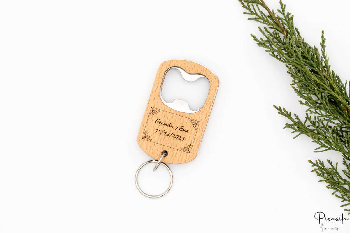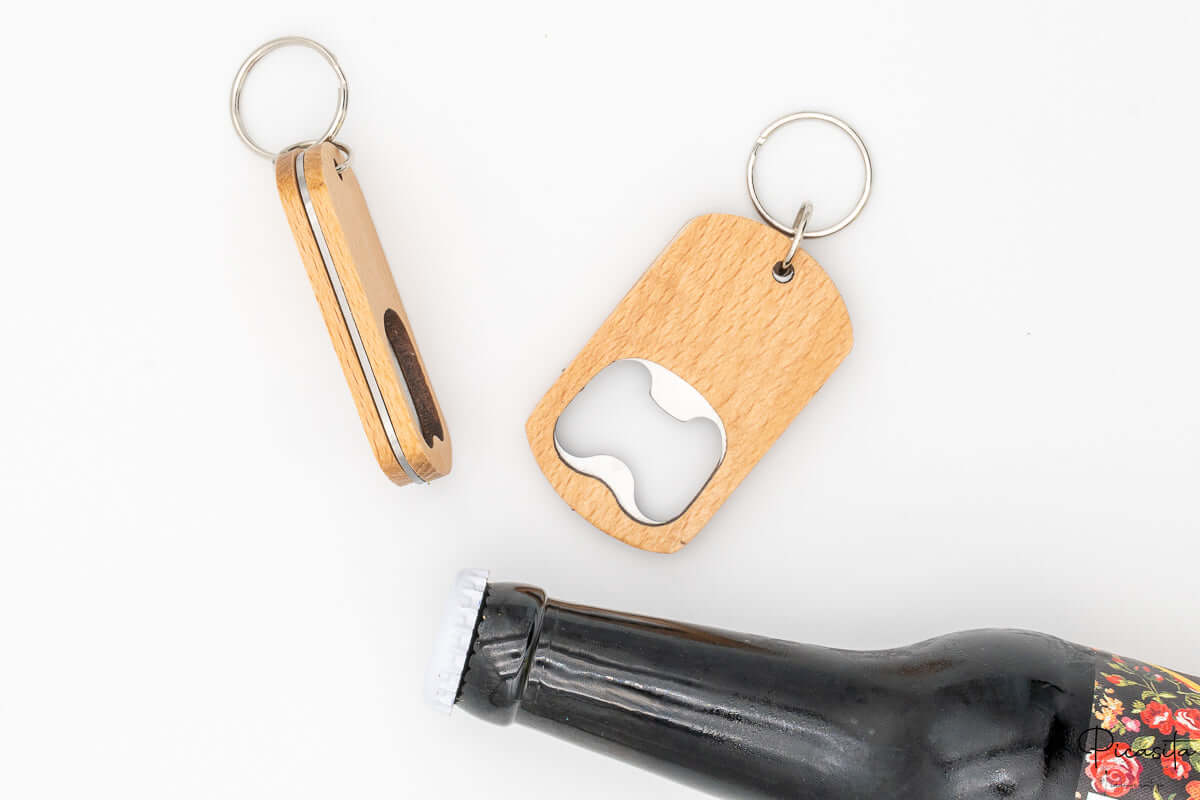 • Modèle Hêtre Porte-clés : Le souvenir le plus pratique et portable. Fabriqué en bois de hêtre clair, il inclut un anneau solide pour que vos invités puissent toujours porter leur décapsuleur personnalisé avec eux sur leurs clés de maison ou de voiture.