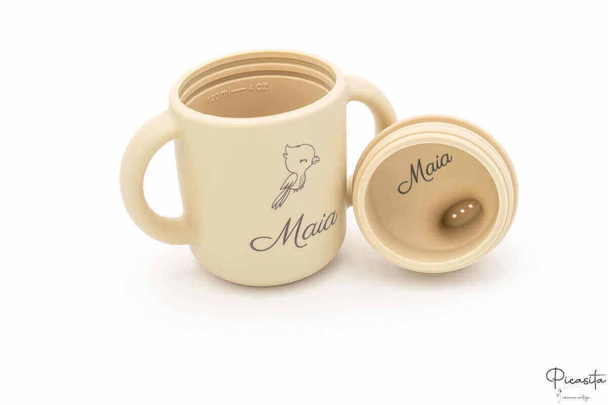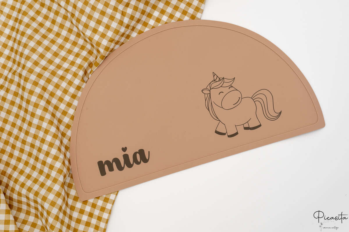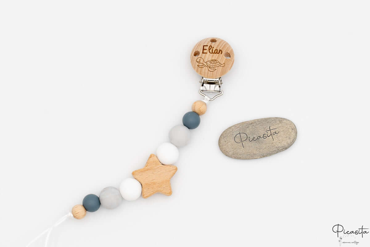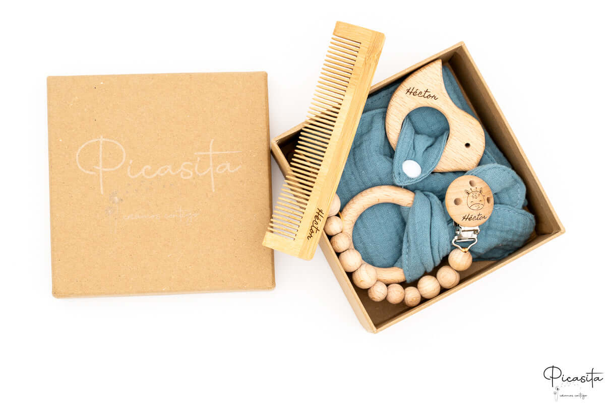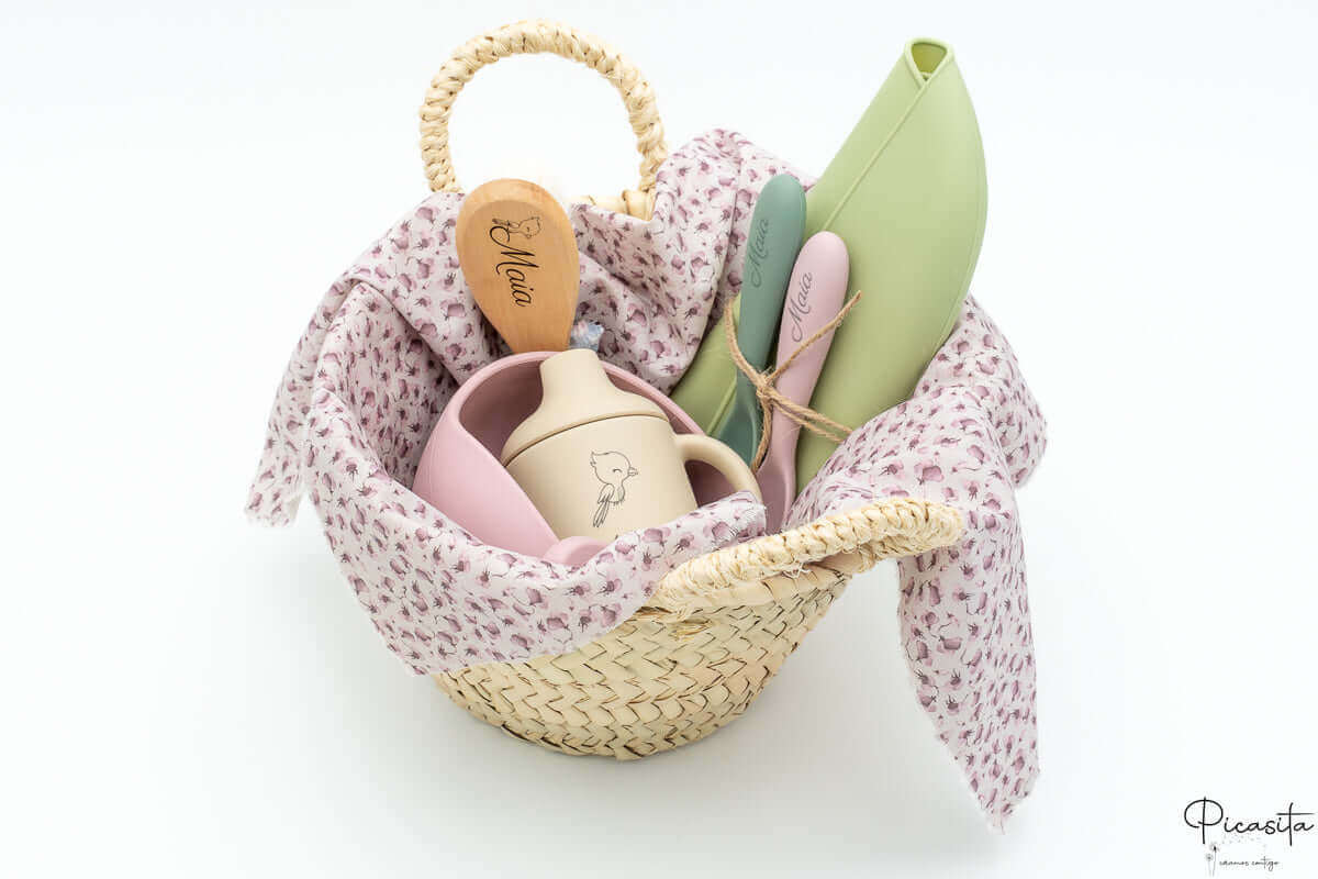 Ce qui transforme vraiment ce cadeau nouveau-né en une pièce unique, c'est la personnalisation. Nous appliquons le nom du bébé avec un laser de haute précision sur tous les articles en silicone, bois et vaisselle (comme les assiettes, couverts, brosses ou attaches-sucettes), obtenant une finition élégante en ton gris foncé ou brûlé qui ne s'efface pas. Pour les textiles, comme les mousselines ou les sacs, nous utilisons un vinyle thermocollant très résistant.