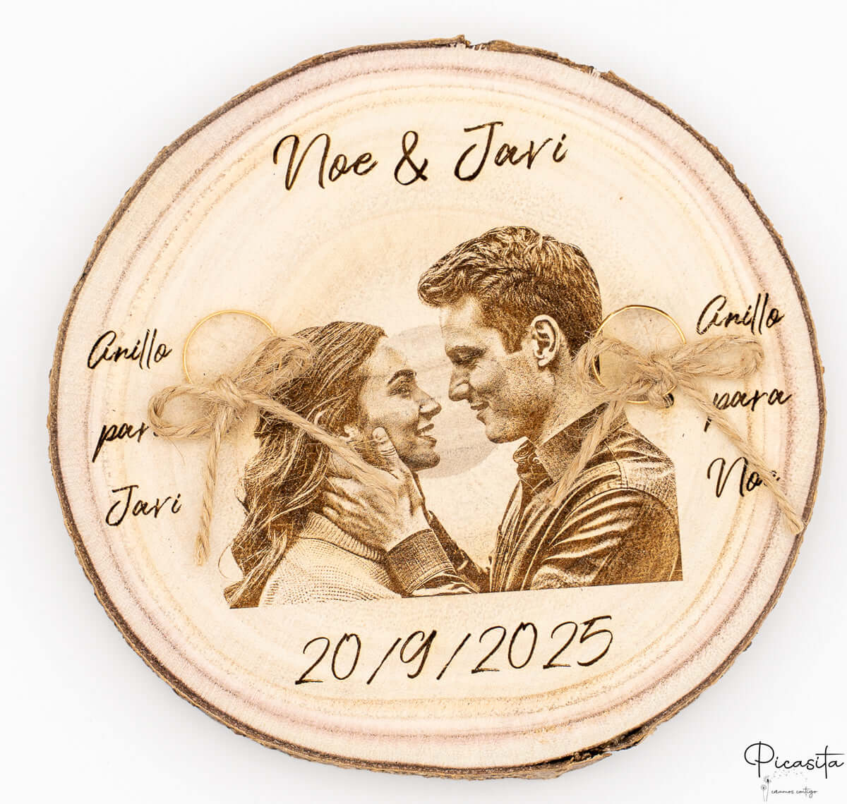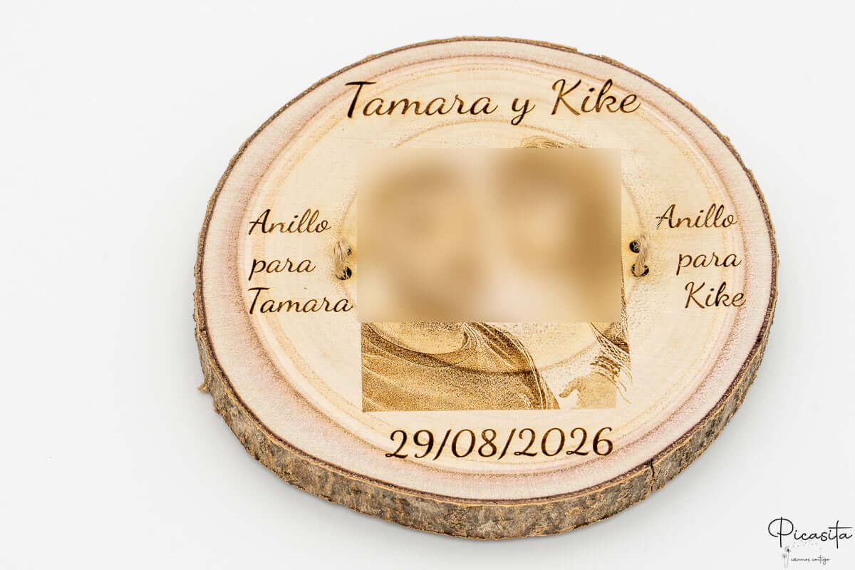 Ce qui rend vraiment spécial ce porte-alliances gravé, c’est qu’il devient une toile pour votre histoire. Grâce à la technique de gravure laser de haute précision, nous pouvons reproduire votre photo préférée ou un design de texte élégant directement sur le bois. Il est important de noter que, étant une gravure thermique, le résultat est monochrome et la netteté finale du porte-alliances dépendra directement de la résolution et de la qualité de l’image que vous nous fournirez.