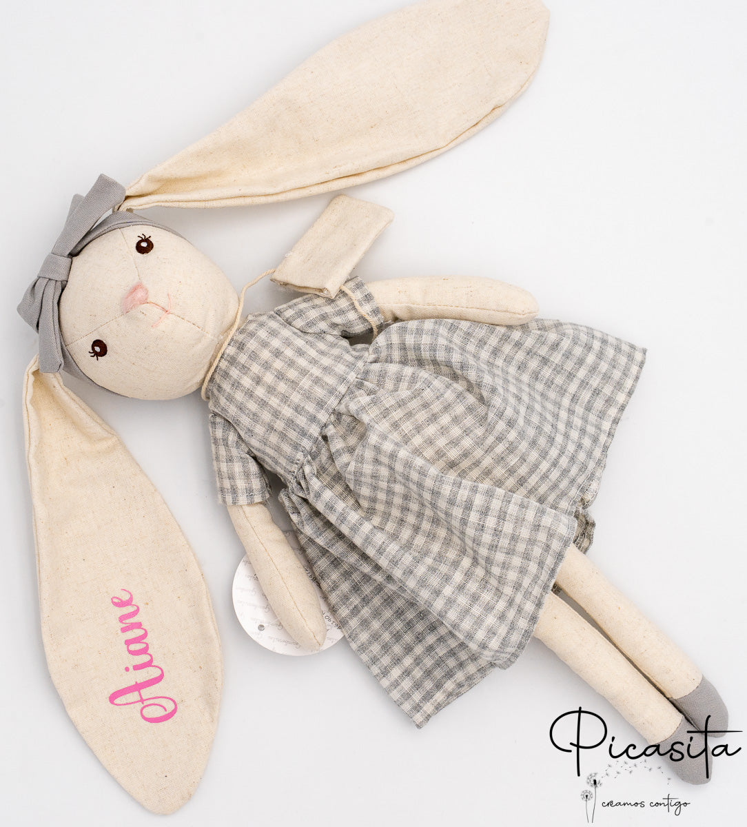 Cette poupée lapinette n’est pas seulement un jouet ; c’est une pièce d’attachement avec des détails soignés au maximum. Elle porte une élégante robe à carreaux vichy gris et blanc, agrémentée d’un serre-tête assorti qui met en valeur ses longues et douces oreilles. De plus, elle comprend un petit sac bandoulière qui ajoute une touche de charme traditionnel. Sa taille de 40,0 cm la rend parfaite pour être câlinée, transportée et aimée aussi bien par les bébés que par les petites filles plus grandes.