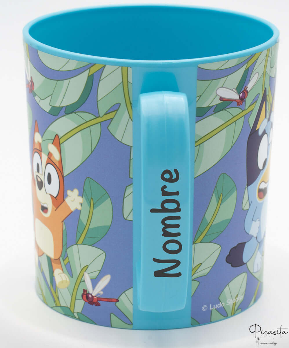 Contrairement aux autocollants qui se décollent ou aux marqueurs qui s'effacent avec le frottement, notre personnalisation sur la tasse Bluey est permanente. Le nom est doucement gravé sur le matériau de la anse dans une teinte sombre/grisâtre, créant une marque indélébile qui garantit que le produit revient toujours à la maison. C'est la manière la plus hygiénique d'assurer que votre fils ou fille utilise toujours son propre récipient.