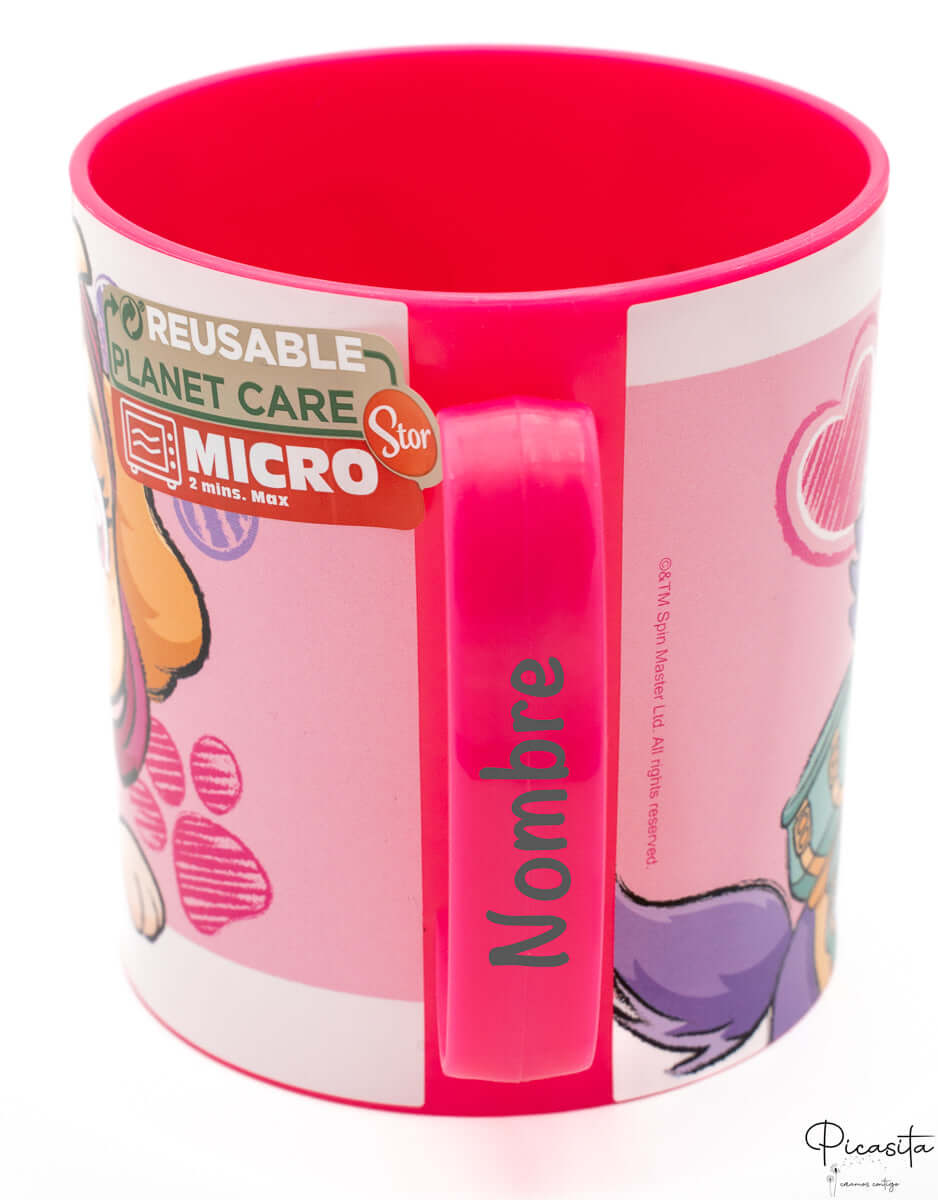 Ce produit est conforme à la réglementation CE 1935/2004 et est exempt de BPA et de phtalates. Il est compatible avec le micro-ondes (maximum 2 minutes) et le lave-vaisselle. Pour conserver la vivacité du dessin de la tasse de Chase, de la tasse de Marshall et de la tasse de Rubble, nous recommandons un lavage à la main sans éponges abrasives, car l'impression extérieure peut se dégrader avec le temps, contrairement au nom gravé qui est éternel.