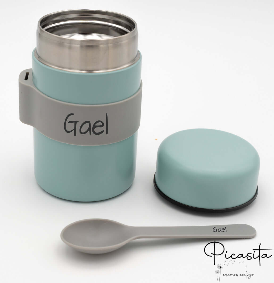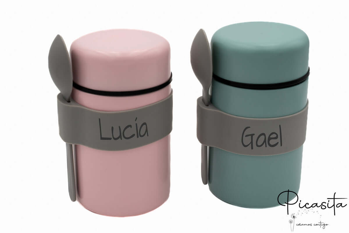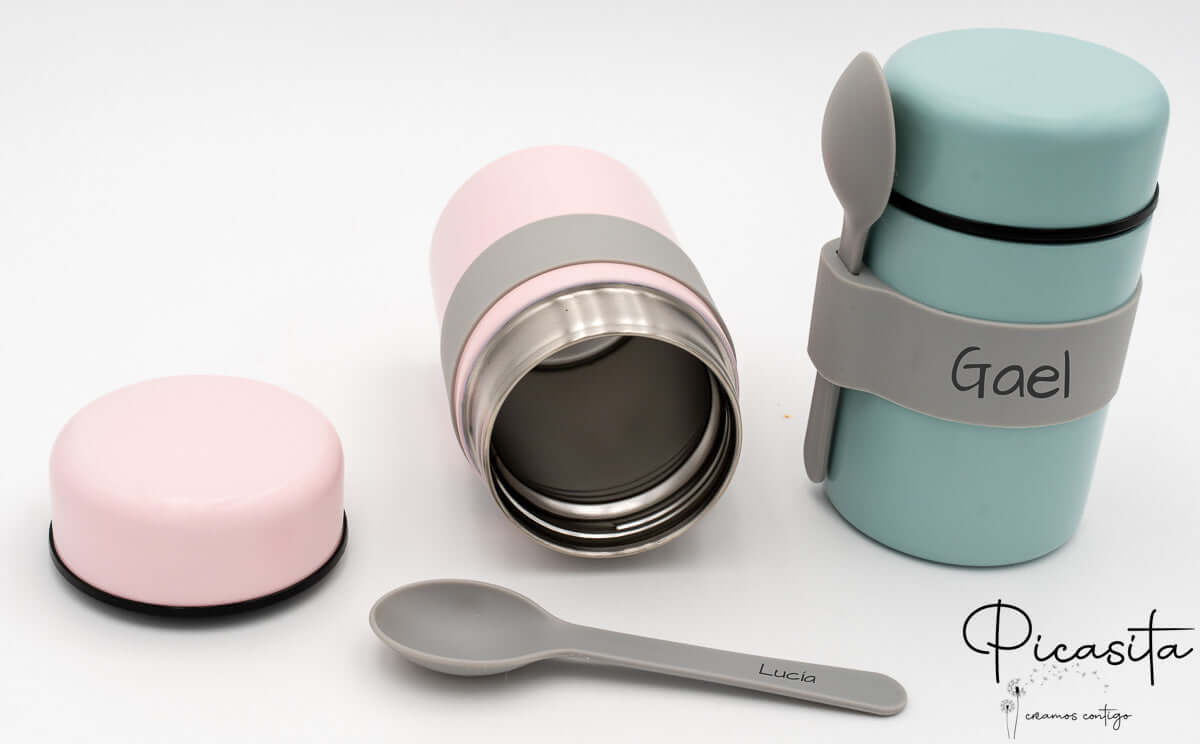 Nous rendons ce thermos pour repas chauds unique. Nous personnalisons à la fois la bande de maintien et le manche de la cuillère en gravant le nom au laser de haute précision. Contrairement aux autocollants, cette technique brûle superficiellement le matériau en laissant une finition élégante et monochrome (gris foncé/noir) qui ne s’efface jamais, même avec une utilisation intensive. Pour compléter l’équipement de votre petit, nous vous invitons à découvrir notre gamme de Vaisselle Enfant Personnalisée et à assortir les couleurs.